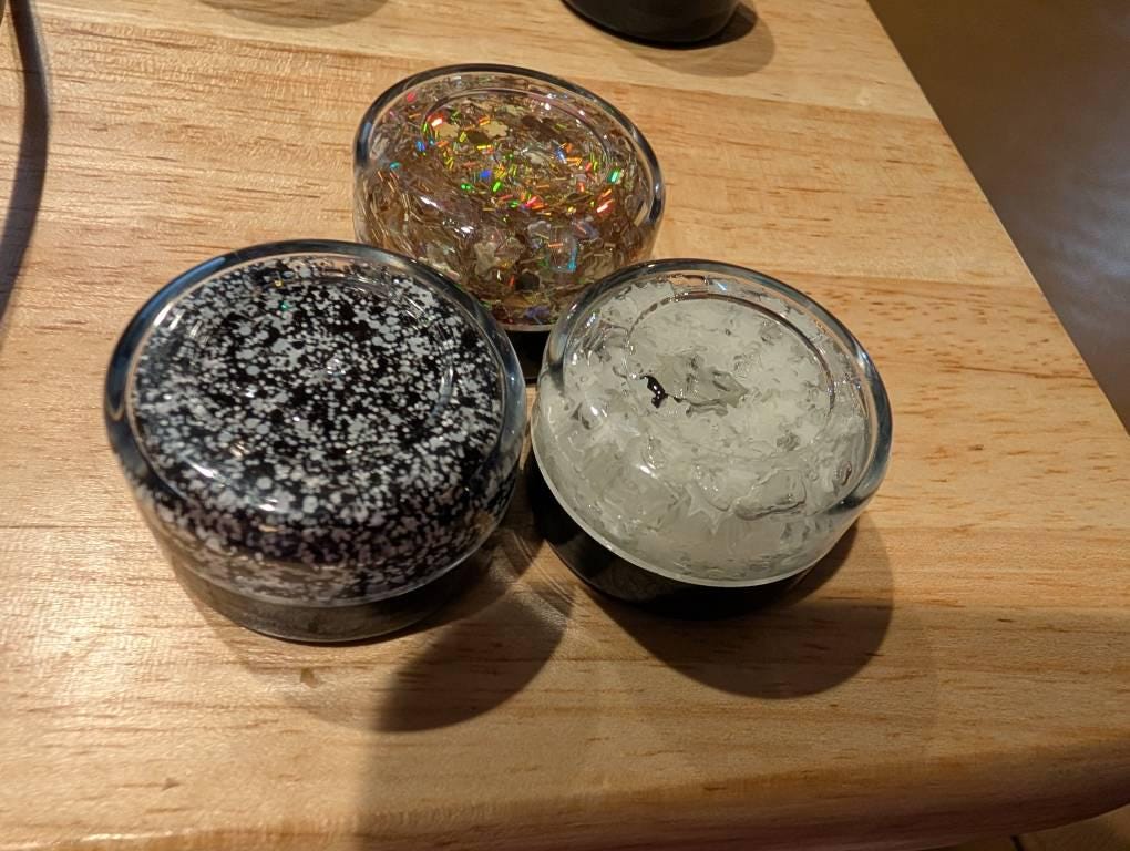 These hair gels, which can also be used as body glitters, are varied, sticky but not too sticky, unique, pretty, shiny, not olfactorily offensive, and, as far as I can tell (having very sensitive skin) hypoallergenic. This one was a bit disappointing as it doesn't seem to actually glow in the dark, maybe it needs to charge.
